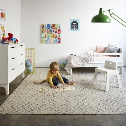 I was talking with a client last night about her funky bedroom size. She was interested in an area rug but there were no really great sizing solution to fit the space. I suggested using modular carpet tiles to create her own size.